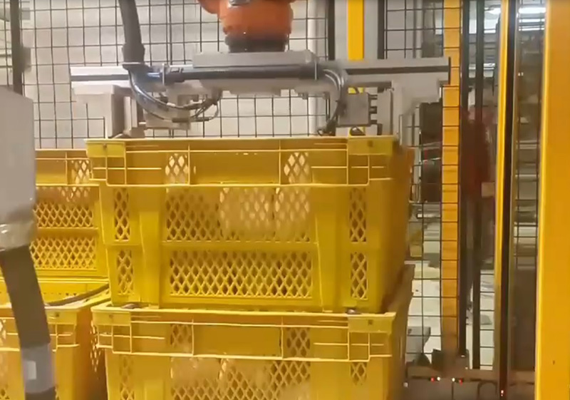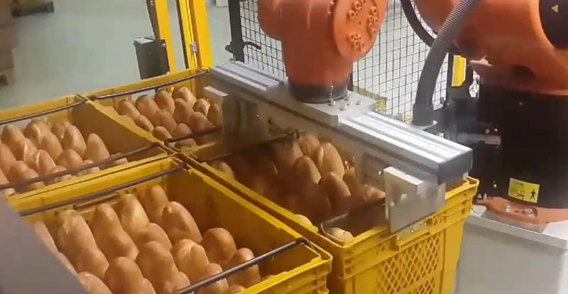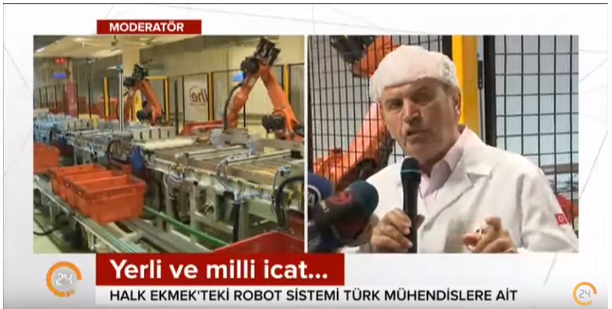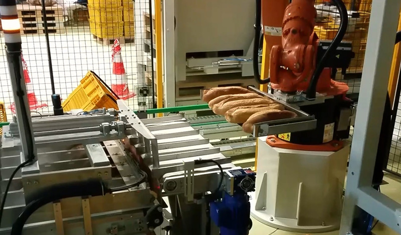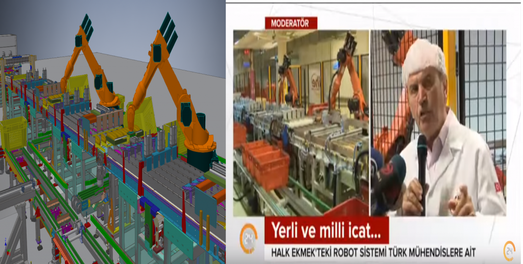 Mekanik tasarım ve projelendirmesini üstlendiğimiz, İHE CEVİZLİ FABRİKASI NORMAL EKMEK HAT SONU OTOMASYONUYLA, ekmekler görüntü işleme tekniğiyle kalite kontrol edilip, el değmeden robotlarla kasalara dizilmekte ve dolu kasalar, robot ile paletlenmektedir.